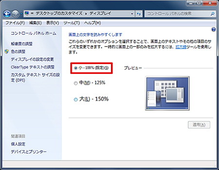 「小(100%)」を選択します。変更を適用するには一旦ログオフし、再ログインする必要があります。
